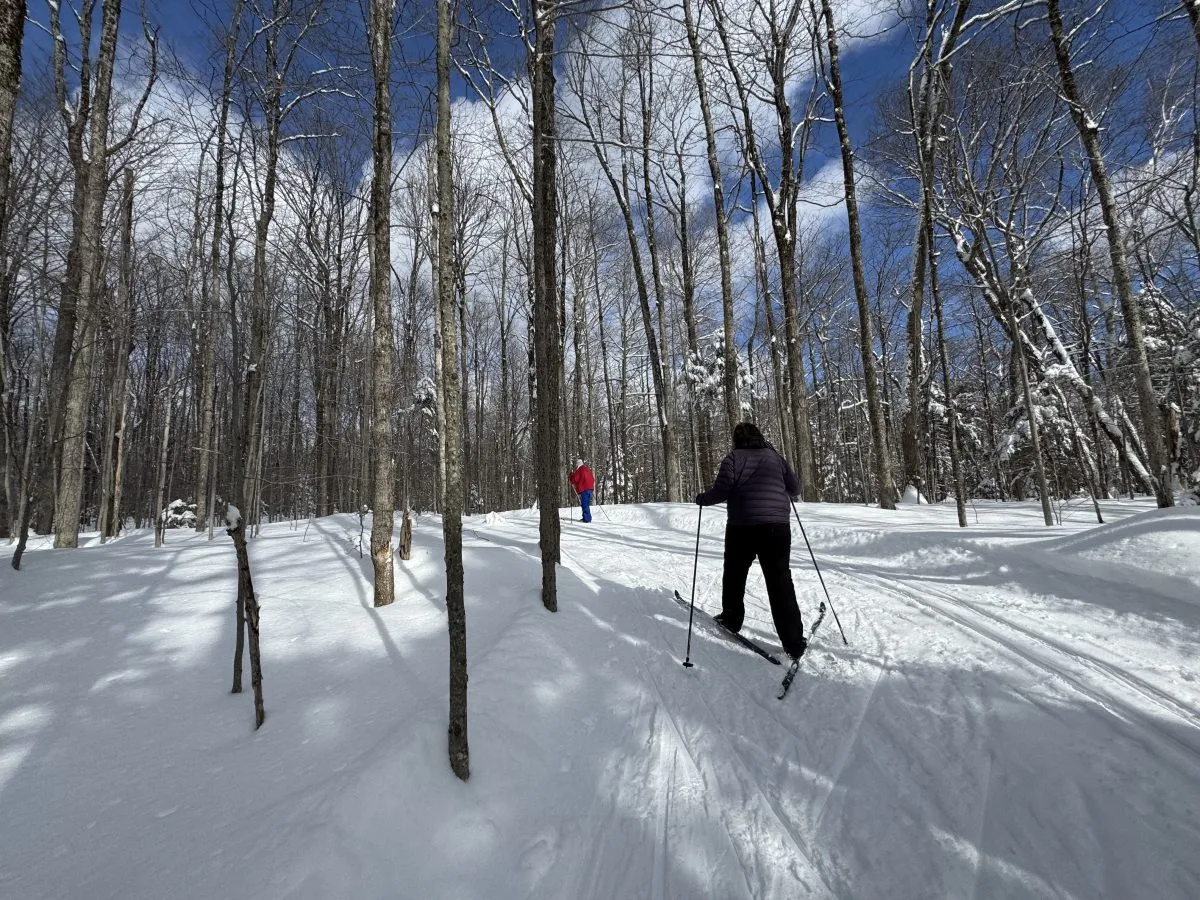 Stratton Nordic Center is more expansive than Wild Wings, with roughly double the trail mileage, offering wide-open fields, wooded paths, and separate areas for both “classic skiing” and “skate skiing”, as well as snowshoeing trails. Classic skiing is the traditional forward-glide style in parallel tracks, easy to pick up and steady for beginners, while skate skiing pushes the skis out in a V-shape, is faster and more athletic. Rentals and lessons are available, and staff help match you to the trails that fit your level.